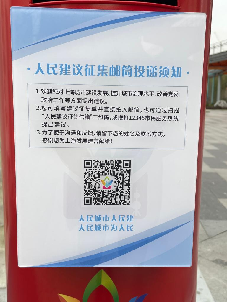 小小邮筒,关乎民生。人民建议征集邮筒统一以“中国红”为底色,邮筒“投递须知”上写明:“欢迎您对上海城市建设发展、提升城市治理水平、改善党委政府工作等方面提出建议”。投递方式上,既可填写纸质人民建议征集单,像寄信一样就近投递,也可通过扫描邮筒上的“人民建议征集信箱”二维码或拨打12345市民服务热线提出建议。