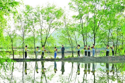 在江西万载县马步乡洞口村,老师和学生们在柳树下阅读。邓龙华摄/光明图片