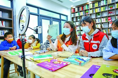 在江苏如皋市如城街道顾庄社区农家书屋内,志愿者通过网络平台为学生推荐好书。徐慧摄/光明图片