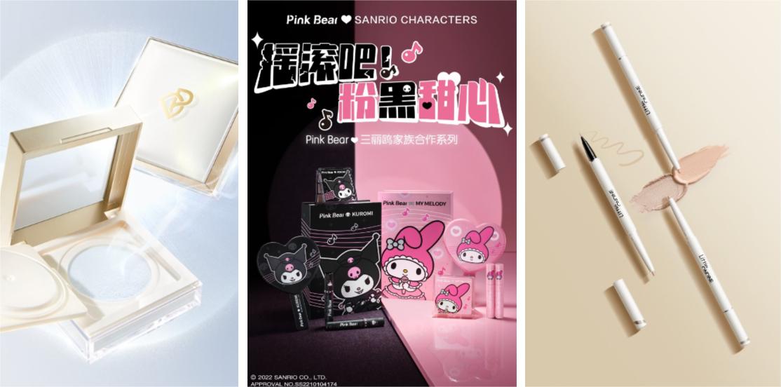 其它两大品牌则专注自身优势,走特色发展的道路: 如Little Ondine小奥汀全新推出的「3D」卧蚕笔,从6月上线到“双十二”期间,全渠道销售额超4000万。Pink Bear皮可熊则持续释放少女心元素,携手三丽鸥家族推出年度联名系列礼盒。