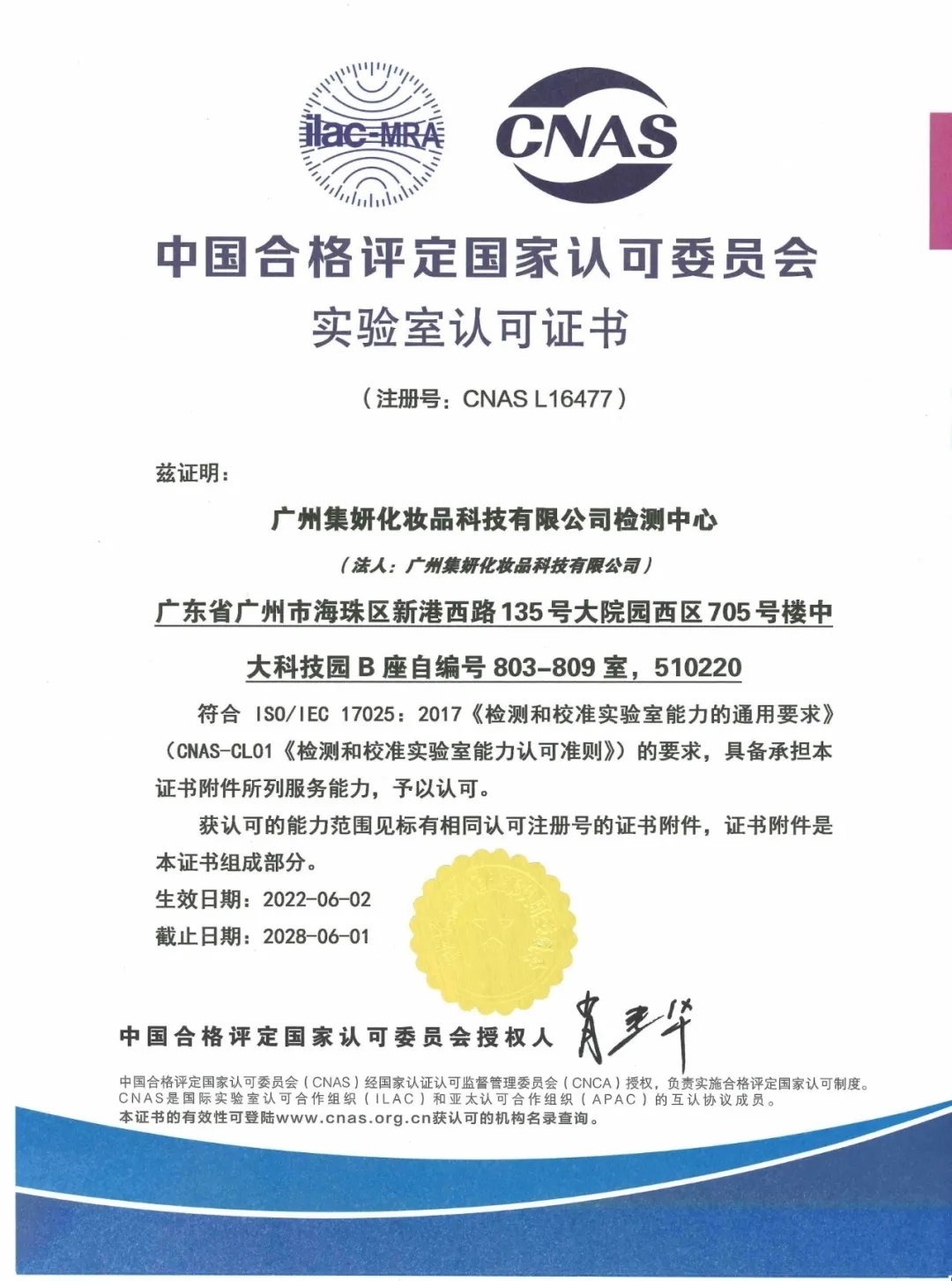 CNAS出具的实验室认可证书