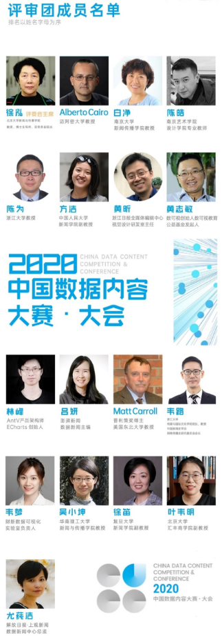 由中国新闻史学会网络传播史研究委员会提供学术指导,由浙江大学传媒与国际文化学院、数可视教育公益基金联合主办的“2020中国数据内容大赛”已经开启作品征集,本次大赛邀请北京大学新闻与传播学院教授、博士生导师、前常务副院长徐泓老师出任大赛评委会主席,并由国内外16位在数据内容制作领域的知名学者和资深从业者担任评审。