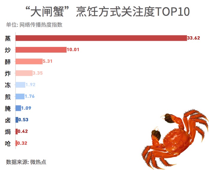 在“吃货”眼里,占据C位的仍是最著名的“中华绒螯蟹”,也就是人们俗称的“大闸蟹”。在“不同蟹类网络关注度调查”中,大闸蟹名列前茅,紧随其后的是梭子蟹和青蟹 。