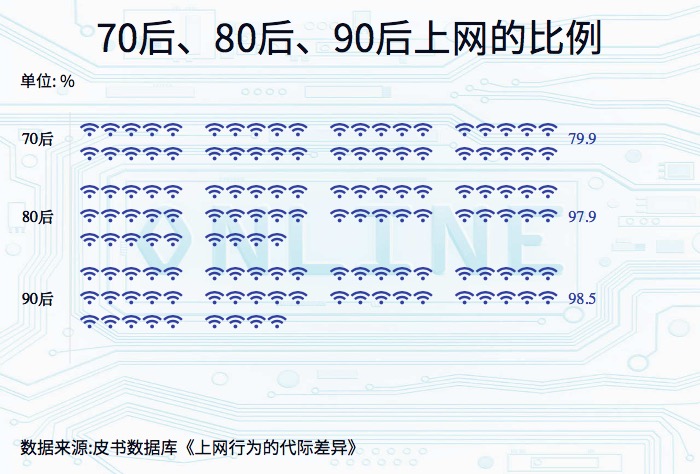 根据中国社会科学院社会科学文献出版社发布的《上网行为的代际差异》报告中的数据,70后、80后、90后上网的比例分别为79. 9%、97. 9%和98. 5%。这表明, 随着时代的发展, 年轻人上网的比例越来越高, 相对来说, 70后和80后之间的差异较大, 而80后和90后更为接近, 全民上网的现象主要体现在他们这两代人身上。从这个意义上看, 第一道互联网鸿沟或者互联网鸿沟更多地出现在 20 世纪70年代出生的人群和80年代出生的人群中。