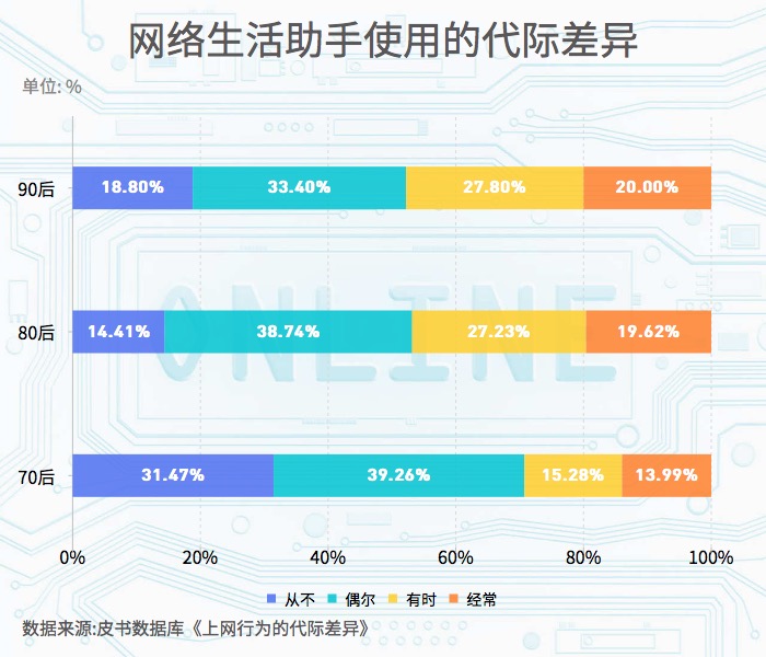 80后和90后使用网络作为生活助手的情况较为相近, 而70后使用网络作为生活助手的比例相对较低。70后、80后、90后经常将网络作为生活助手的比例分别为 14.0% 、19.6% 、20.0% ,而70后、80后、90后从不将网络作为生活助手的比例分别为31. 5%、14. 4%和18. 8% 。
