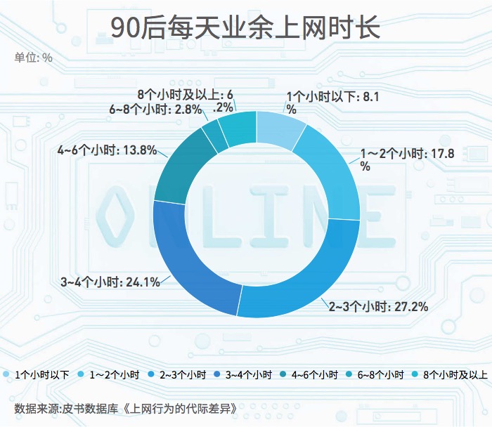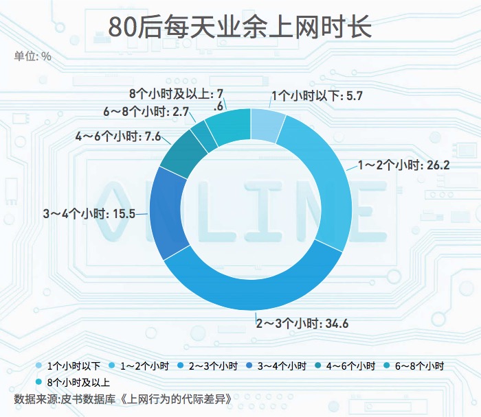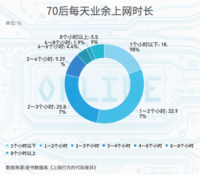 不同代际的人群每天上网时长有较大差别, 基本趋势是年纪越轻, 上网时间较长的比例就越高。按照分组数据的均值估计办法, 70后、80 后、90后每天业余平均上网时间分别为2. 44、3. 08和3. 28个小时。