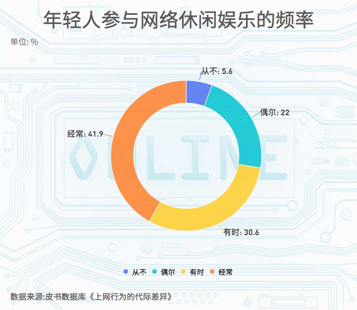 自互联网进入民用开始, 网络游戏一直是网络应用的重要方面, 而随着网络传输速度的提高, 网络视频、网络音乐成为年轻人喜爱的休闲娱乐活动。有 41. 9% 的被调查者表示自己经常参与网络休闲娱乐活动, 有时参与的比例也高达 30.6%, 偶尔参与的比例为22.0%, 从不参与的比例仅为5.6%。 这一结果表明, 被调查者参与网络休闲娱乐的比例较高。