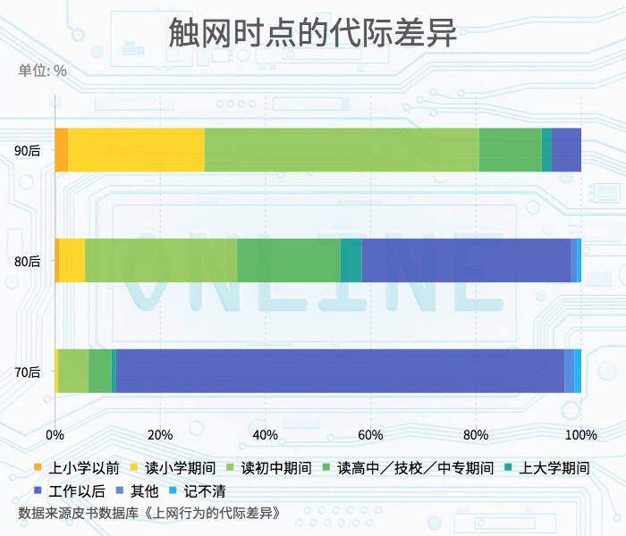 触网时点指的是人们第一次接触互联网的时间。85.2%的70后是在“工作以后”才开始触网, 在“读初中期间”触网的比例仅仅为5.7%;对80后来说, 39.8%也是在“工作以后”才开始触网,但在“读初中期间”触网的比例已经达到了28.9%,这表明80后触网的年龄已经较70后有所提前;90后“读初中期间”触网的比例达到52. 2%,更有25.9%的在“读小学期间”就开始触网。
