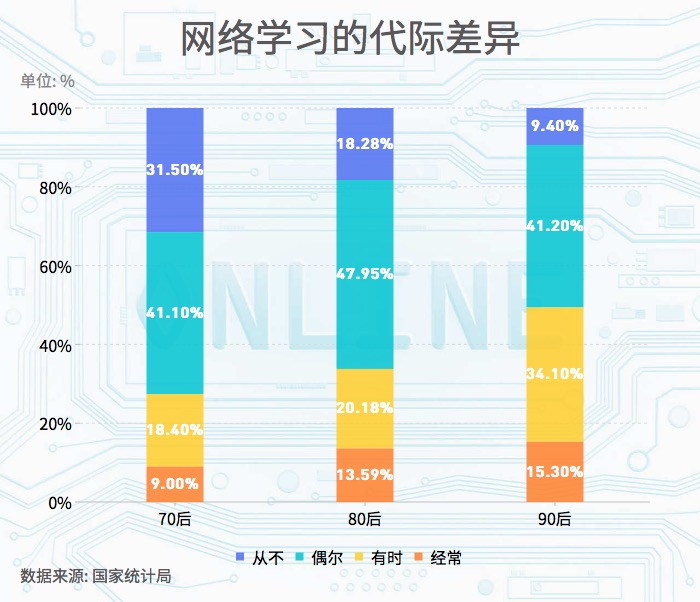 总体来看, 年纪越轻, 参加在线学习的比例越高。90后经常参加网络学习的比例为15.3%, 80后的这一比例为13.6%, 而70后的这一比例仅为9.0%。并且,90后、80后和70后有时参加网络学习的比例分别为34.1%、20.2%和18.4%。