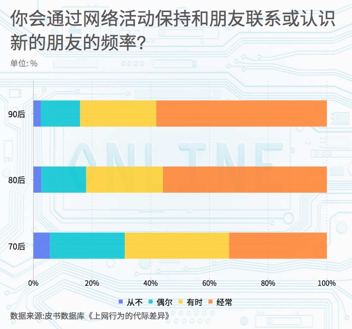 网络交往 (internet communication) 指的是人和组织借助网络而联系在 一起, 并且利用网络进行沟通和交流的情况。在70后、 80后和90后这三个群体中, 进行网络交往活动的比例存在着明显差异。70后和80后,90后在经常使用网络上差异明显,70后经常使用网络的比例为33.3%,而80后和90后经常使用网络的比例以已超过一半。