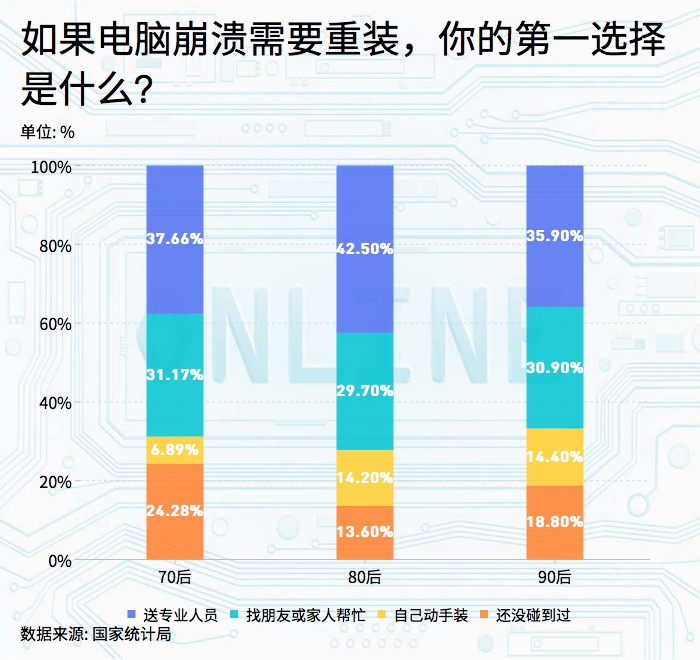电脑是互联网发展早期的主要上网工具。而电脑由于操作系统、 病毒攻 击等种种原因常常出现系统崩溃的情况, 即俗称的宕机。在这种情况下,人们经常需要重新安装操作系统。但从交互分析部分的结果中可以发现,70后、80后、90后选择“自己动手装”的比例分别为6.9%、14.2%和14.4%,这表明80后和90 后选择“自己动手装”的比例比70后群体要高。