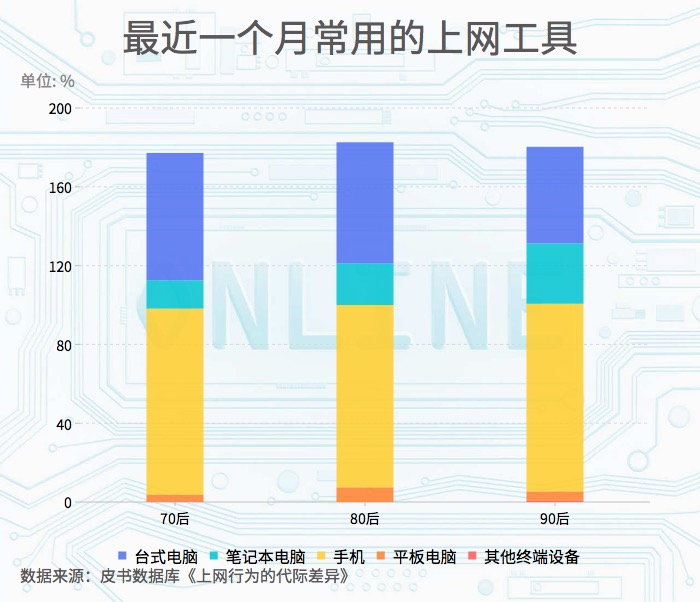 数据表明, 手机是95. 9%的被调查者经常使用的上网工具, 而使用台式电脑上网的比例也高达70.5%, 相对来说, 使用其他终端设备上网的比例较低。代与代之间的主要差异在于90后使用台式电脑的比例远低于80后和70 后。同时, 使用笔记本电脑上网的比例在70后、80后、90后三个群体中则逐渐升高,在90后中有超过30%的比例将笔记本作为主要上网工具之一。相比于70后和90后,80后使用平板电脑上网的比例最高。