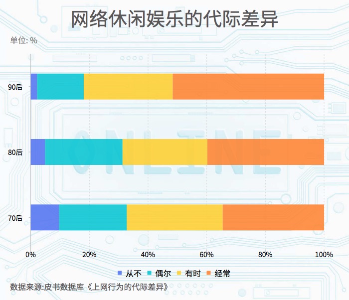 70后和80后在这方面的差距较小。但90后经常或有时参与网络休闲娱乐活动的比例分别为51.6%和30.3%, 合计为81.9%, 这和70 后、 80后形成明显的差异。
