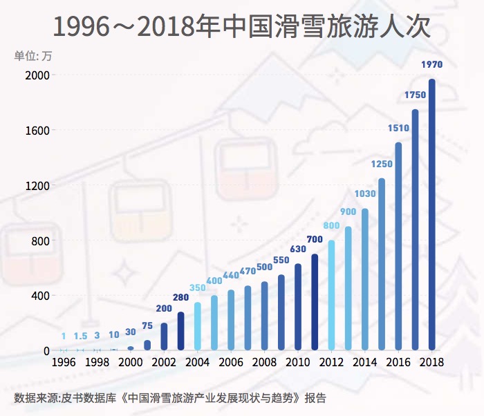 滑雪人次增长迅速但滑雪参与率和转换率低。从1996年发展至今, 我国滑雪旅游人次实现了质的飞跃。截至2018年底, 我国滑雪人次为1970万, 同比增长12.57%。基于庞大的滑雪人次和市场规模,中国已被认为是全球主要滑雪市场之一,年滑雪人次已超过一些拥有成熟滑雪市场的国家。