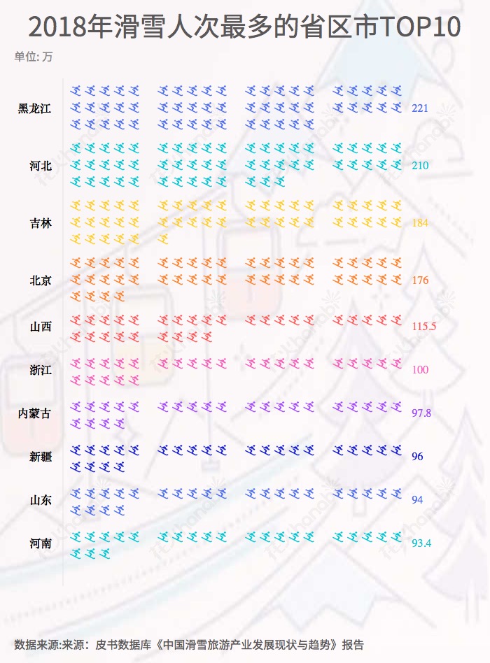 黑龙江和河北的滑雪场拥有最多的滑雪人次,分别占全国的11.2%和10.7%。虽然随着技术进步, 南方滑雪场数量逐渐增多, 但依旧不是滑雪者优先选择的滑雪旅游目的地, 滑雪人次占比很低。