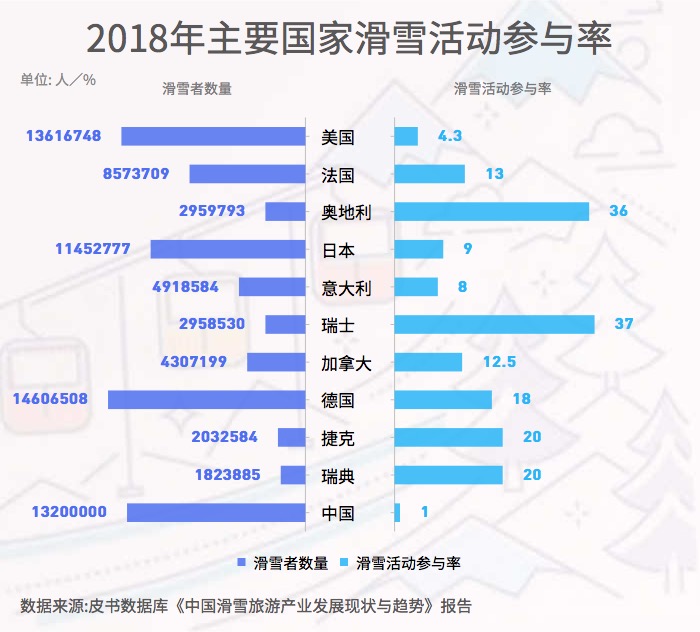 虽然我国年滑雪旅游人次较多, 但我国滑雪者占总人口的比例仍远低于其他国家。滑雪活动参与率仅有1%。