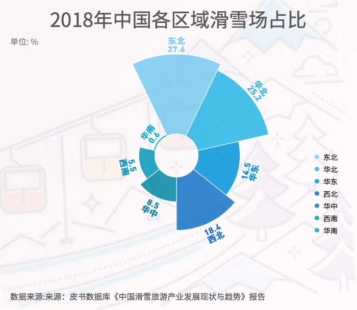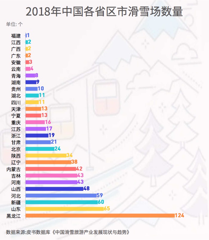 由于冰雪资源条件限制,我国滑雪场空间分布极不均衡。黑龙江有124个滑雪场, 远远超过位于第二位的山东 (65个) ,其次是新疆 (60个)和河北 (59个), 而华南地区的(广西、广东)滑雪场数量不到1%。