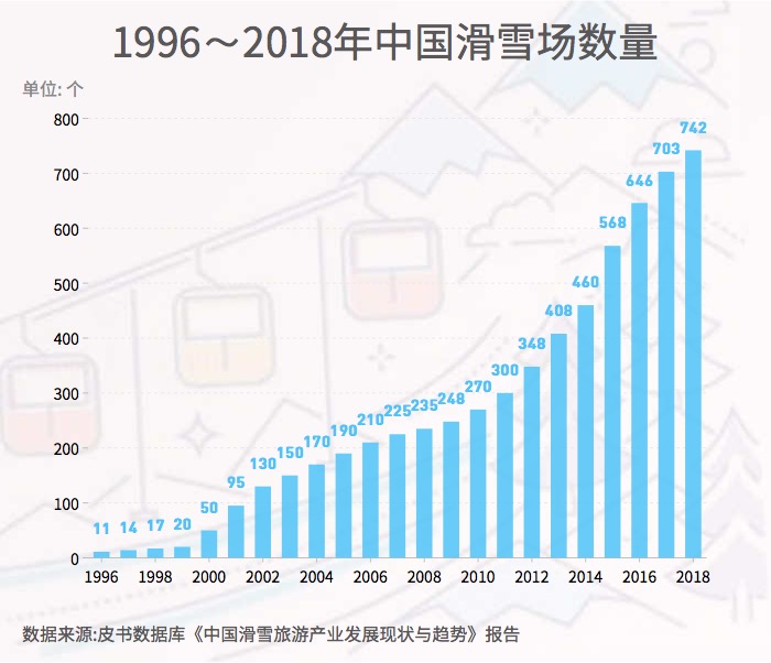 滑雪场数量位列世界首位从20世纪80年代东北建立第一个滑雪场发展至2018年,中国已有742个滑雪场(其中室内滑雪场26个), 数量位列世界第一。