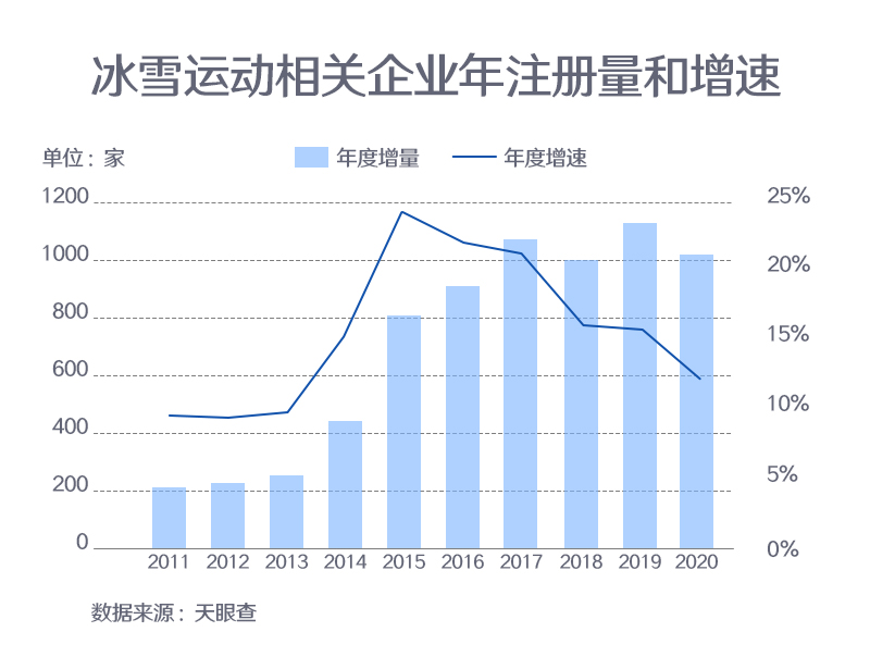 资料显示,2015年7月31日,北京获得2022年冬奥会举办权。同年,天眼查专业版数据显示,冰雪运动相关企业年度注册增速达到了历史峰值(全部企业状态),为24.4%。此后的几年,冰雪运动相关企业总量仍呈上涨态势。以工商登记为准,2020年我国共新增超过1,000家冰雪运动相关企业。