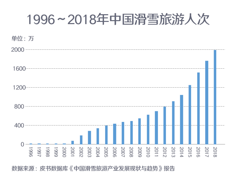 从1996年发展至今, 我国滑雪旅游人次实现了质的飞跃。截至2018年底, 我国滑雪人次为1970万, 同比增长12.57%。基于庞大的滑雪人次和市场规模,中国已被认为是全球主要滑雪市场之一,年滑雪人次已超过一些拥有成熟滑雪市场的国家。