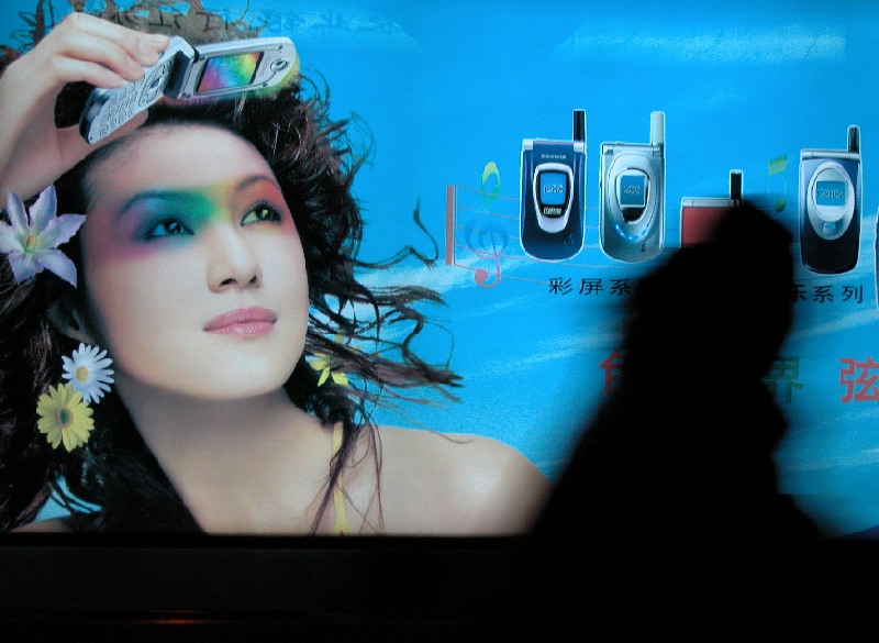 2003年7月23日,一行人正从南京街头精美的联想彩屏手机广告牌前经过。(郎从柳摄)