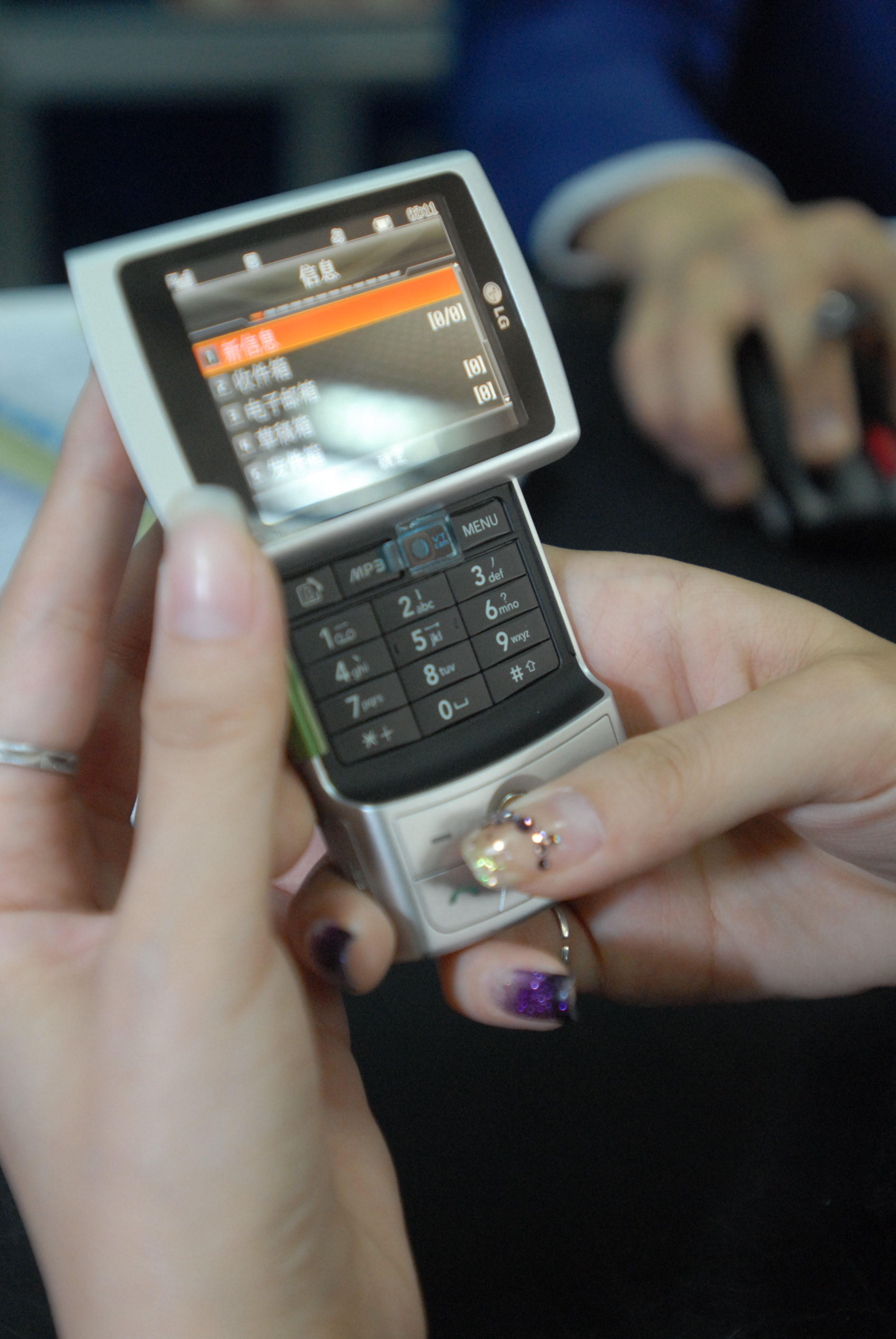 2008年4月1日,沈阳市民正在选购、试用3G手机。(王齐波摄)