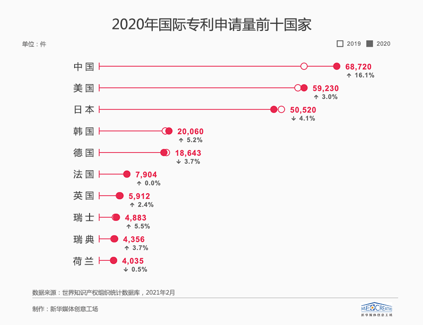 世界知识产权组织3月2日发布2020年专利、商标和工业品外观设计国际注册成果显示,2020年中国国际专利申请量连续第二年在全球独占鳌头,这再次表明亚洲正如何在这种新常态中引领创新。