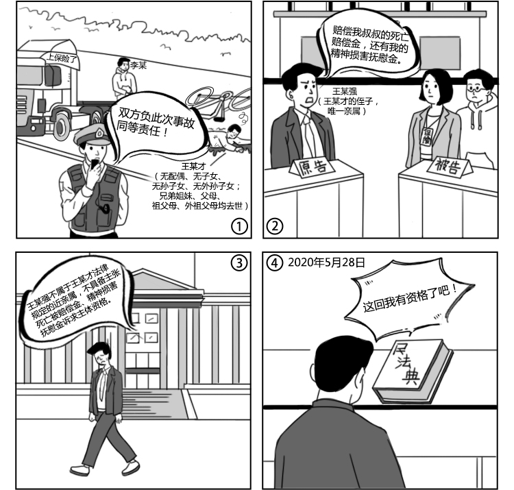 综上,盐城中院依法改判由某保险公司向王某赔偿因叔叔王某才死亡产生的死亡赔偿金、丧葬费、误工费、交通费等各项损失合计272494.64元。
