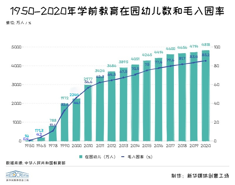 新中国成立以来,我国学前教育实现了快速发展。1950年我国学前教育在园儿童人数仅为14万人,这个数字在2020年达到4818万,学前教育毛入园率更是从1950年0.4%提高到2020年的85.2%。