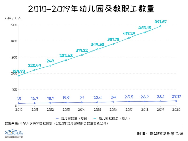 2020年,全国幼儿园总数达到29.17万所,与2010年相比几乎翻了一倍。于此同时,我国幼儿教师也逐渐增多,学历层次逐年提高。2019年我国幼儿园教职工491.57万人,比上年增加38.42万人,增长8.48%。根据教育部最新数据显示,2019年全国306.68万幼儿园园长和专任教师中,本科及以上学历的比例为25.75%,专科学历的比例为57.83%,合计为83.58%。