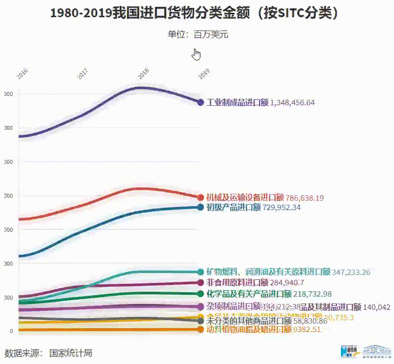 随着改革开放步伐加快,我国主要进口商品发生了显著变化,贸易结构不断优化。1979年,以谷物为代表的农产品是我国第一大进口商品,而到了2018年,以集成电路为代表的工业制成品成为我国第一大进口商品。