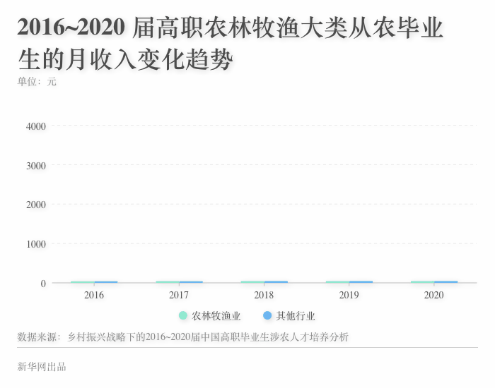 涉农专业毕业生中从农人群的月收入近五年稳步增长,从2016届的3490 元增长到了2020届的4272元,整体上略高于在其他行业领域就业的毕业生月收入。
