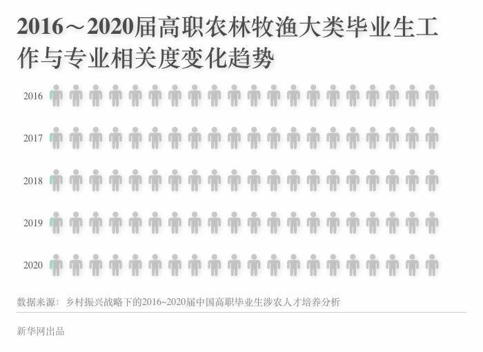 高职农林牧渔大类专业毕业生从农的比例也有了明显提升。数据显示,近五届农林牧渔大类专业毕业生在毕业后选择从农的比例从2016届的43.6%上升到了2020届的48.7%。乡村振兴需要一批爱农业、有知识、懂技术的专业人才投身农业农村现代化建设。