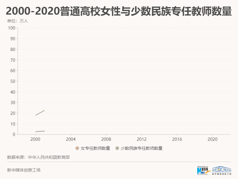 女专任教师、少数民族专任教师的比重不断提升。根据教育部历年的教育统计数据,2000年我国普通高校专任女教师仅有17万余名,占专任教师总数的38.2%。到2020年,我国已有93万余名专任女教师,占比提高到了51.2%,高等教育方面展现出“妇女能顶半边天"的良好气象。少数民族专任教师从2000年的2万余名发展到2020年数量接近11万,可见各地区高等教育正在朝向均衡发展。