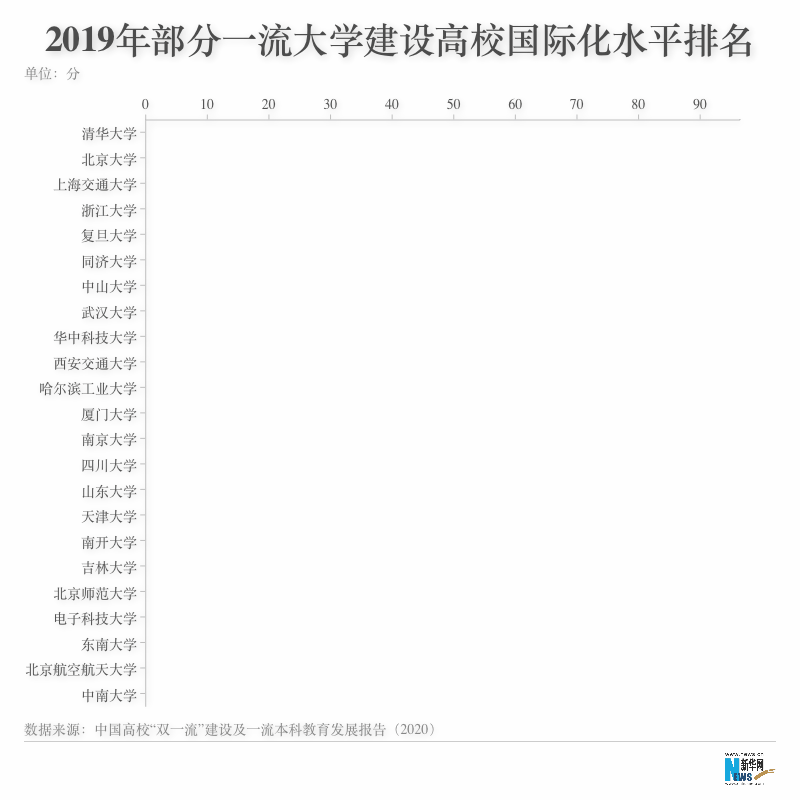 根据西南交通大学发布的《大学国际化水平排名(URI-2019)》,一流大学建设高校国际化水平排名显示,清华大学位居第一,其次是北京大学、上海交通大学、浙江大学、复旦大学。得60分以上的高校有23所,占比较低,且高分和低分的差距较大,说明国际资源的分配不均衡。“引进来”和 “走出去”的力度有待进一步加大。以国外留学生为例, 实行“宽进宽出”的政策,生源质量和培养质量均有待提升。
