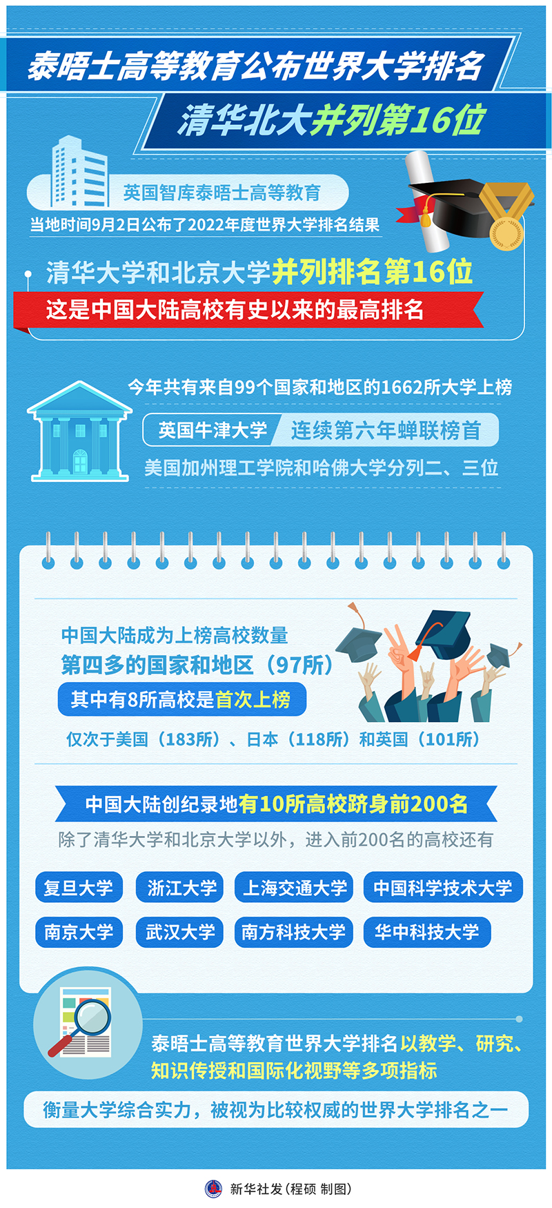 编辑:孙丽颖 设计:马璐璐 2021-09-14 10:52:26 来源: 新华网英国智库泰晤士高等教育近日公布了2022年度世界大学排名结果,清华大学和北京大学并列排名第16位,这是中国大陆高校有史以来的最高排名。