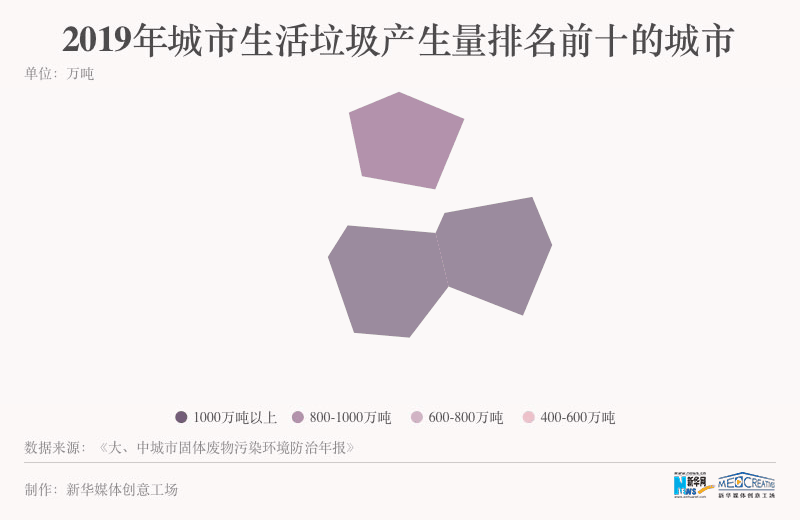 塑料垃圾只是众多城市垃圾中的一个缩影。随着城市的快速发展和人民生活水平的提高,每年产生的城市生活垃圾越来越多。据《2020年全国大、中城市固体废物污染环境防治年报》数据显示,2019年,196个大、中城市生活垃圾产生量为23560.2万吨。其中城市生活垃圾产生量最大的是上海市,产生量为1076.8万吨,其次是北京、广州、重庆和深圳,产生量分别为1011.2万吨、808.8万吨、738.1万吨和712.4万吨。