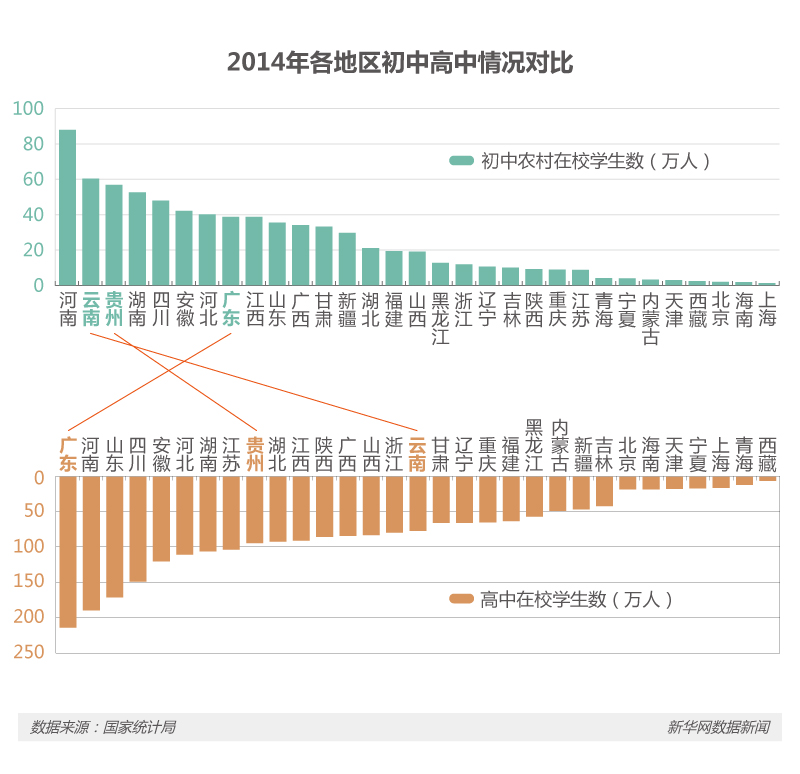 尽管各地对雇佣童工普遍采取了高压态势,但为何童工现象屡禁不止?童工大多来自于我国经济发展相对落后的云南、贵州等地,贫困使得他们本应在求知的年纪却选择了外出求职。扶贫先扶智,加大对当地义务教育的投入是政府、家庭义不容辞的责任。根据数据我们发现,2014年云南农村初中在校生数量位列全国第2位,而高中在校人数仅排在全国第16位。