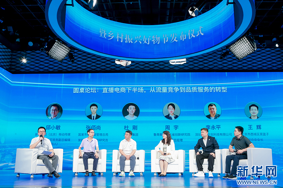 现场由新华炫闻(北京)移动传媒科技有限公司常务副总编辑邱小敏主持,国家市场监督管理总局发展研究中心副研究员张佰尚,三只羊集团CEO杜刚,鲁商集团山东省创新研究院有限公司总经理周宇,深圳幻灵文创科技有限公司CEO李永平,北京市西城区菜篮子联合会会长王辉参与“直播电商下半场:从流量竞争到品质服务的转型”主题圆桌对话环节。新华网发