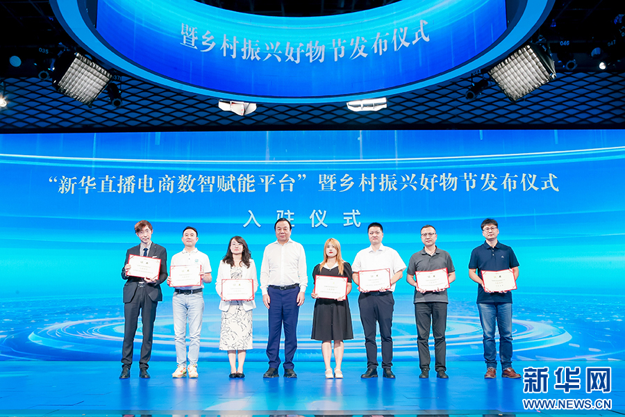 现场由中国电商乡村振兴联盟主席李晓林为首农集团、海南省旅游投资集团、夏商集团、鲁商集团、北京龙顺成中式家具、北京星汉云图、北京普乐普等企业代表颁发入驻证书。新华网发