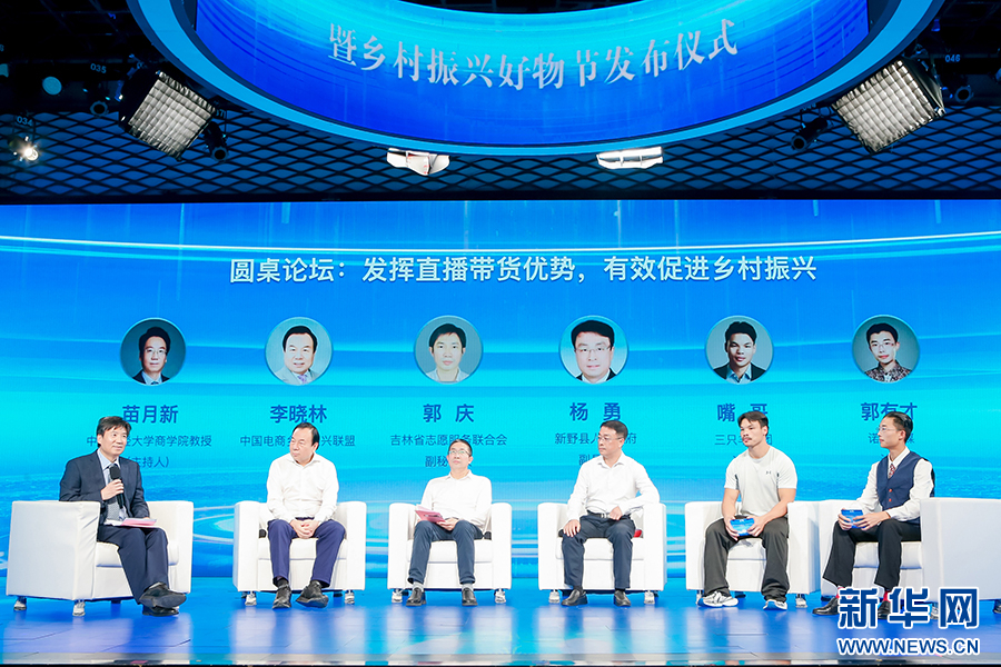 现场由央财经大学商学院教授苗月新主持,中国电商乡村振兴联盟主席李晓林,吉林省志愿服务联合会副秘书长郭庆,新野县人民政府副县长杨勇,三只羊集团达人嘴哥,达人郭有才参与“发挥直播带货优势 有效促进乡村振兴”主题圆桌对话环节。新华网发