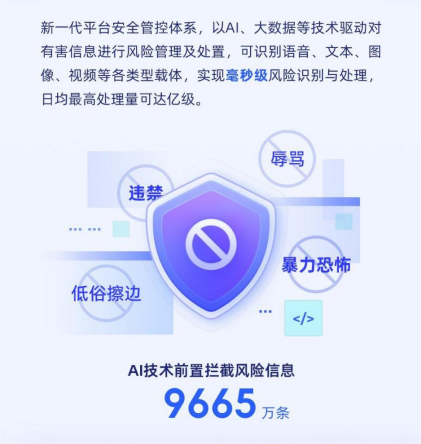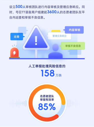 在技术方面,TT语音采用新一代平台安全管控体系,以AI、大数据等技术驱动对有害信息进行风险管理及处置,可识别语音、文本、图像、视频等各类型载体,检测多种恶意违规场景,实现毫秒级风险识别与处理,日均最高处理量可达亿级。半年来,通过AI技术在源头拦截处理的风险内容超过9665万条,涉及不良诱导信息、图片及音频,有效避免了不良信息传播。