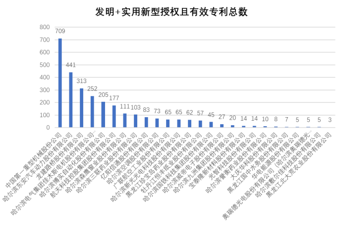 新华网哈尔滨8月24日电(陈延特 实习生王静雯)8月23日,在2024中国企业家太阳岛年会——“数实融合 共筑新生态”金融科技发展论坛上,新华网正式发布《黑龙江上市公司专利价值报告》。报告显示,截至2024年7月31日,黑龙江省40家上市公司共拥有授权且有效的发明和实用新型专利2879件,其中中国第一重型机械股份公司以709件专利位居榜首,其专利估值达3.43亿元,领跑全省。