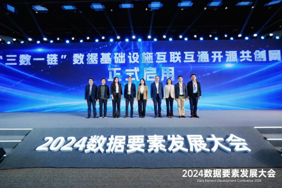 大会现场,由杭州市发改委党组成员、副主任王霞,浙江移动信息系统集成有限公司总经理屠宇飞,浙江电信人工智能中心总经理胡金栋,杭州联通党委副书记、副总经理王静,浙江大数据交易中心总经理孔俊,杭州数据交易所董事长、总经理应琦,安恒信息CTO刘博,趣链科技创始人、首席执行官李伟,杭州高新数联互通总经理卞阳等代表共同启用“三数一链”数据基础设施互联互通开源共创网络(以下简称“三数一链”网络)。这是首个以开源共创模式、实现跨域跨网数据要素互联互通的网络,是为培育全国一体化技术和数据市场而进行一次先行先试探索。