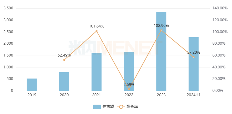 目前,盐酸伐地那非片的主要销售渠道是网上药店,2024上半年的渠道占比超过81%。该产品在网上药店终端的销售额持续暴涨,2023年大涨102.96%销售额突破3000万元,2024上半年的增速也在57.20%。