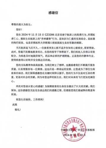近日,北京口腔医院收到南方航空公司广西分公司发来的感谢信,对麻醉科副主任扈大为在航班上救助心脏不适乘客表达感谢。