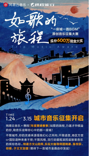 1月24日0点,网易云音乐与携程旅行联合发起“如歌的旅程”——“一座城一首BGM”原创音乐征集大赛正式启动。即日起至2025年3月15日,参赛者可前往网易云音乐APP,搜索“如歌的旅程”进行报名投稿。