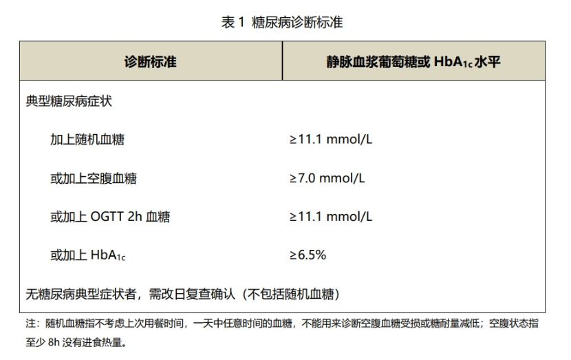 如果有典型的糖尿病症状(如烦渴多饮、多尿、多食、不明原因体重下降),满足空腹静脉血浆葡萄糖≥7.0mmol/L,或OGTT 2h静脉血浆葡萄糖≥11.1mmol/L,或HbA1c≥6.5%,或随机静脉血浆葡萄糖≥11.1mmol/L,可诊断为糖尿病。如果缺乏典型的糖尿病症状,则需要同一时间点的两个血糖指标或两个不同时间点的血糖指标达到或超过诊断切点(不包括随机血糖)方可诊断为糖尿病(表1)。