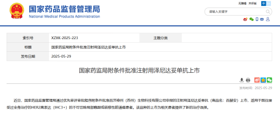 国家药监局附条件批准注射用泽尼达妥单抗上市