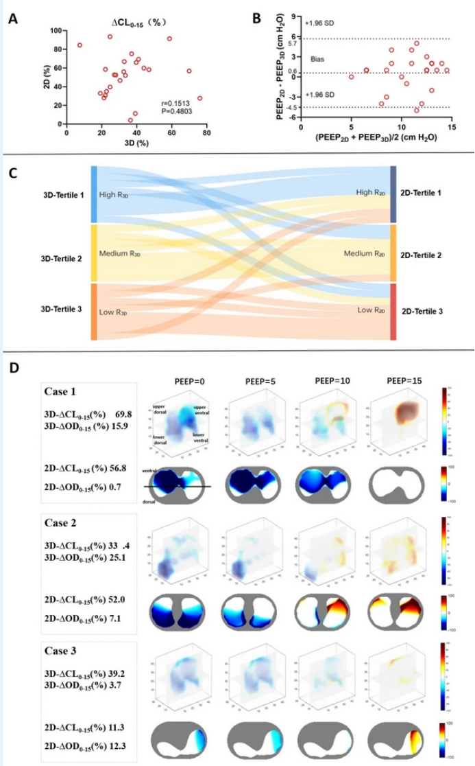 图A:2D-EIT和3D-EIT测量的∆Collapse0–15(%)相关性分析;图B:24次PEEP试验中3D-EIT和2D-EIT判定个体化PEEP的Bland-Altman图;图C:14例患者2D-EIT与3D-EIT的肺可复张评估一致,10例患者2D-EIT与3D-EIT的肺可复张评估不一致;图D:3例患者的2D-EIT和3D-EIT的PEEP滴定EIT影像图像(文/袁思依 陈恔 干玎竹)